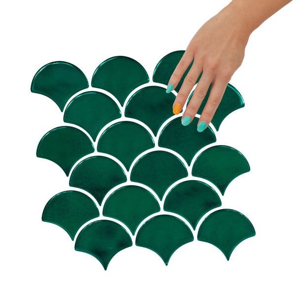 The vinyl tiles come in packs of 4 or as a single sheet and are easily interlocked to form a solid wall of colour that not only looks like real ceramic tiles but is as easy to clean and so much easier to install. The white grout that surrounds the fans provides a good contrast and gives the ties a fresh clean look. Why not style up your home with aquatic elegance.